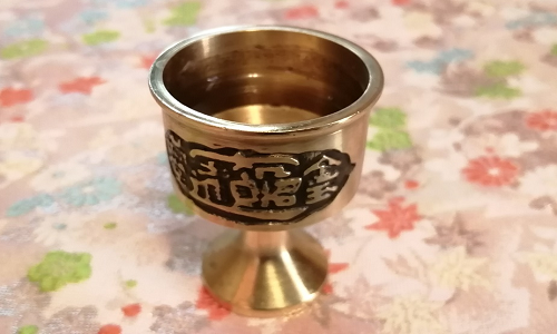 水・米・塩のお供えをおちょこで、そして、両サイドには造花の榊です。
